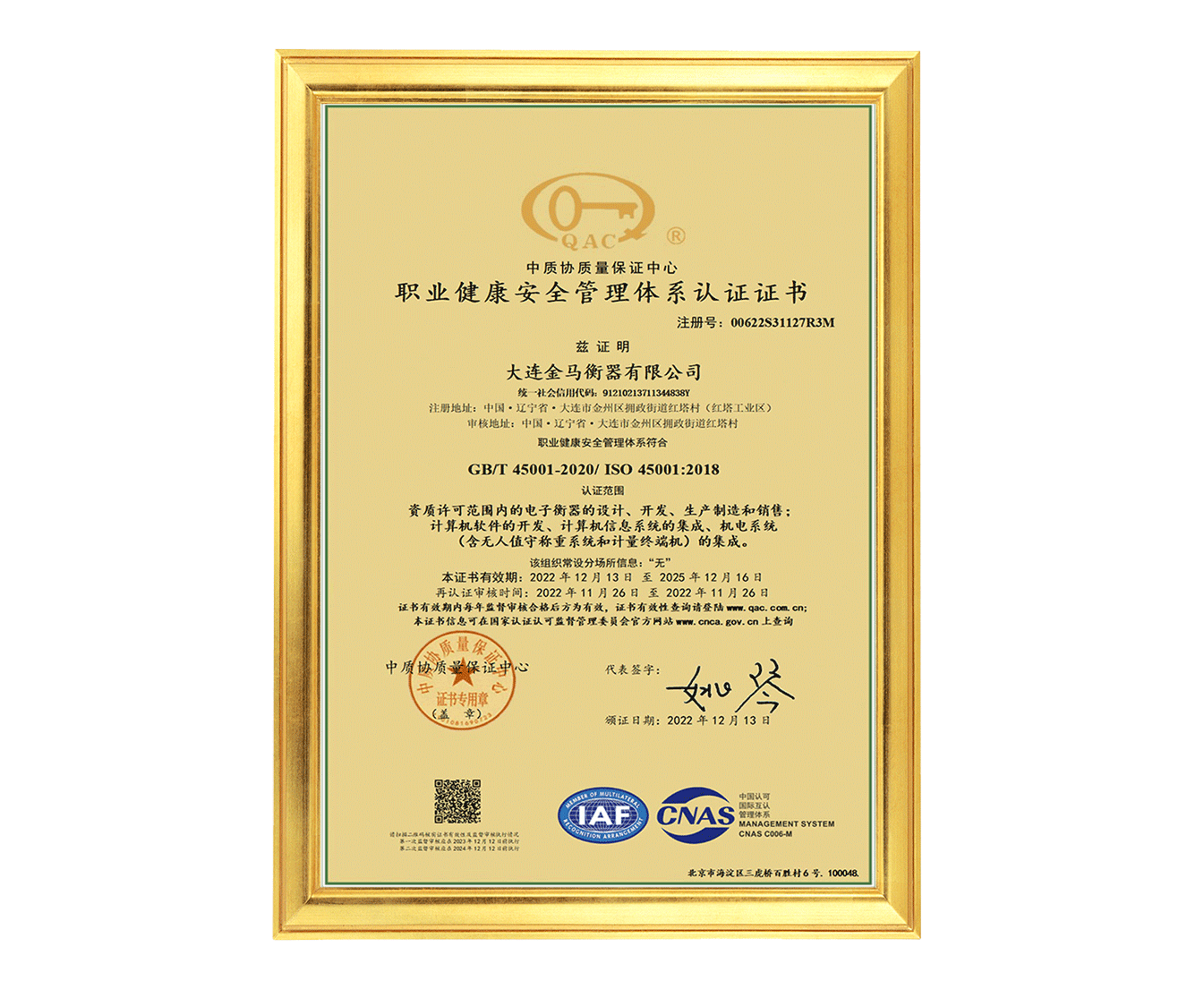 職業(yè)健康安全管理體系認(rèn)證證書