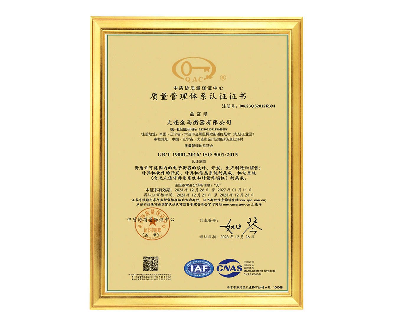 質(zhì)量管理體系認(rèn)證證書